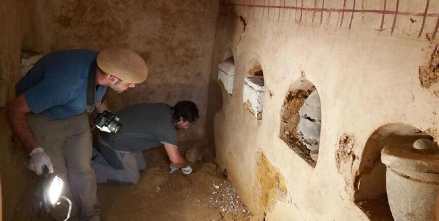 En los espacios libres que quedan en los nichos y por el suelo se han encontrado recipientes como vasijas, platos y vasos de vidrio y cerámicas, en los que se depositaban las ofrendas funerarias. El revestimiento de la cámara funeraria se encuentra además "bien conservado, manteniendo parte de su decoración de motivos geométricos en bóveda y paredes".