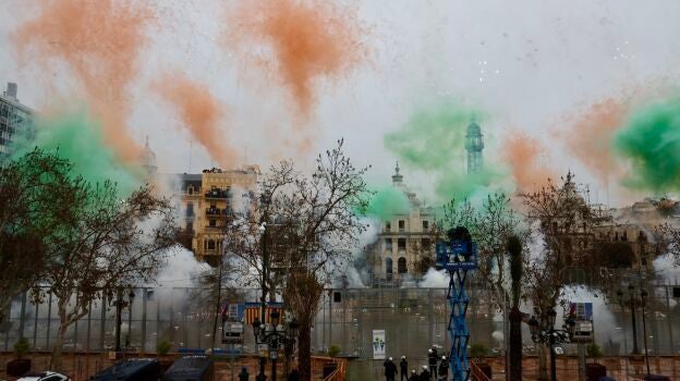 La cuarta generación de una pirotecnia de Castellón ya ha colocado los explosivos en la jaula de la Plaza del Ayuntamiento de Valencia a la espera de que las falleras mayores den la orden para que se inicie el espectáculo.