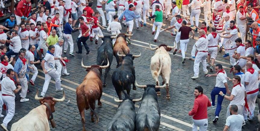 Los encierros de San Fermín se celebran del 7 al 14 de julio a las 8:00 horas por las calles del centro de Pamplona. Corren seis toros, seis cabestros y los pastores en un recorrido que dura entre dos y tres minutos.