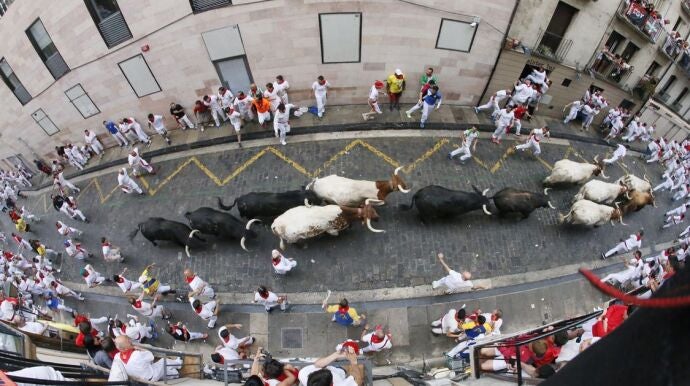 En la curva de la Estafeta, los toros han rozado la pared, pero en ningún momento han llegado a caerse. En este momento un toro negro se ha ubicado al frente, aunque poco después la manada ha quedado dividida.