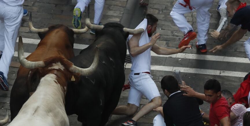 La ganadería gaditana de La Palmosilla debuta en San Fermín 2019 con un veloz y limpio encierro. Aunque no hay ningún herido por asta de toro, dos varones han sido trasladados por contusiones craneales leves al Complejo Hospitalario de Navarra.
