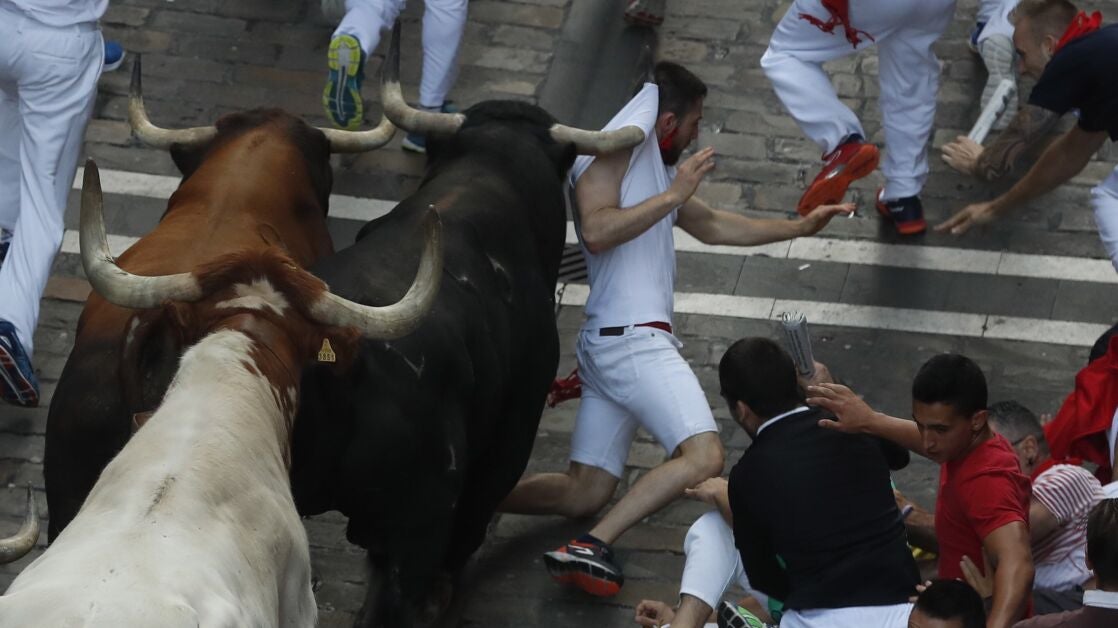 Después de que las campanas de la iglesia de San Cernin hayan anunciando las ocho de la mañana, se ha prendido la mecha que ha abierto el portón de los corrales de los que han partido los astados, encabezados por los cabestros, a los que rápidamente ha rebasado un toro colorado, al que se han sumado varios de sus hermanos llegando en algunos momentos hasta situarse cuatro toros en cabeza.