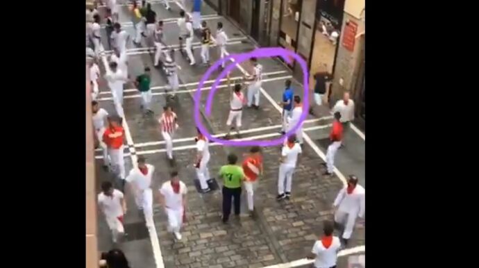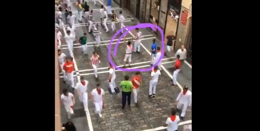 Los corredores esquivan al hombre que está cometiendo la imprudencia y éste, al ver la llegada de los toros, intenta girar y empezar su carrera. Pero es demasiado tarde y uno de los cabestros le alcanza, aunque afortunadamente lo hace con la cabeza y no con el asta.