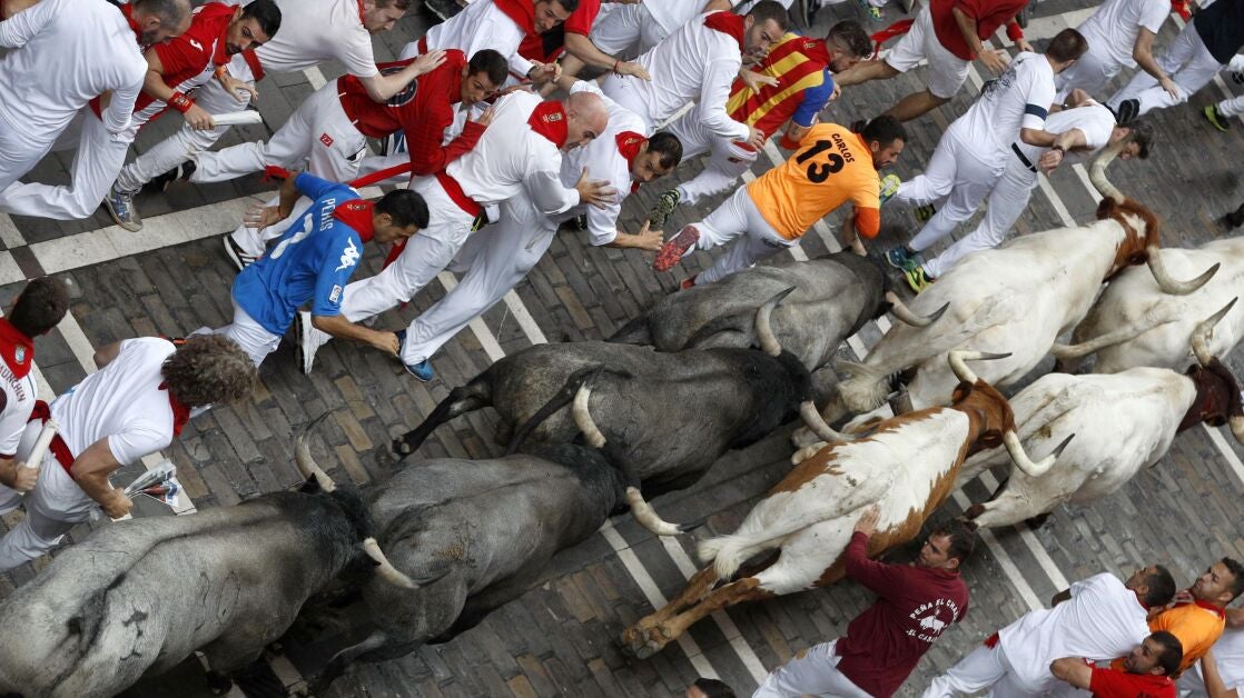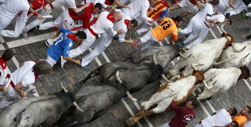 En esta ocasión, y no como sucedió en sus tres primeras participaciones en los encierros de San Fermín, ninguno de los toros se ha vuelto sobre sus pasos y la torada ha corrido prácticamente agrupada durante todo el recorrido, con pequeños huecos en algunos puntos que han permitido lucirse a los mozos.