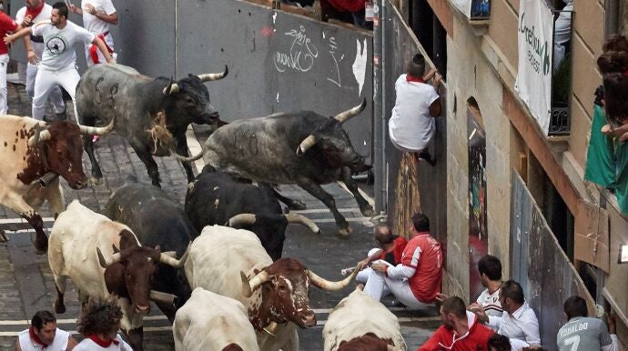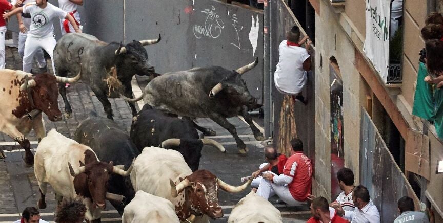 Por detrás, el toro colorado ha seguido en solitario, dejando tres corneados y escenas de peligro a su paso. Así, en Estafeta, un mozo que ha salida hacia el centro de la calle desde la derecha ha recibido una cornada en la pierna izquierda.