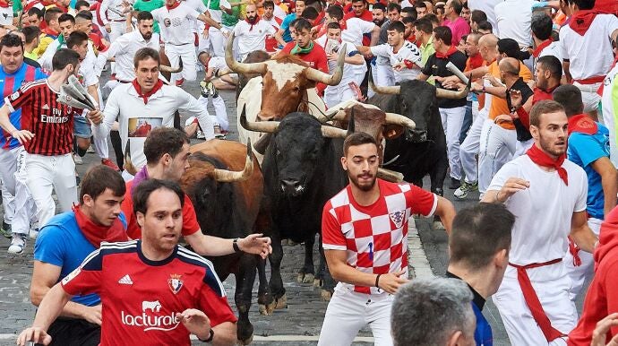 Los toros de la ganadería gaditana La Palmosilla han debutado hoy en Pamplona en el séptimo y penúltimo encierro de los Sanfermines 2019.