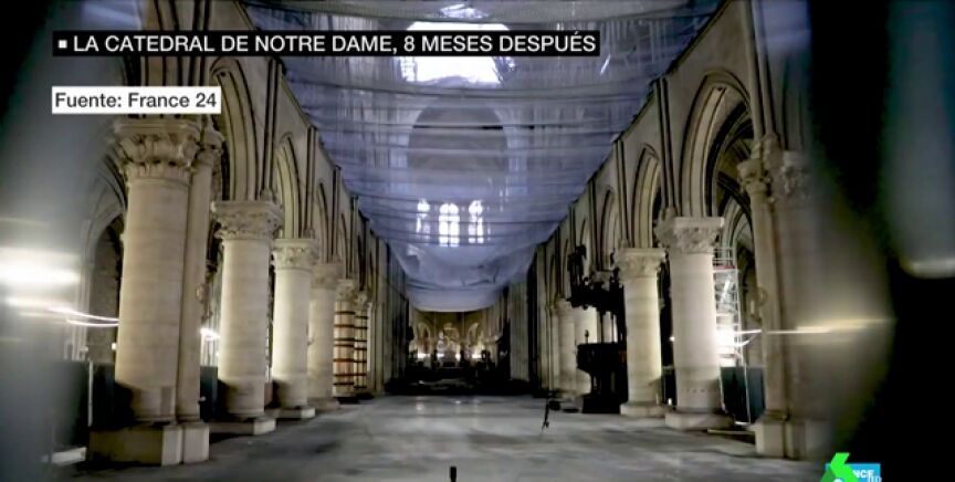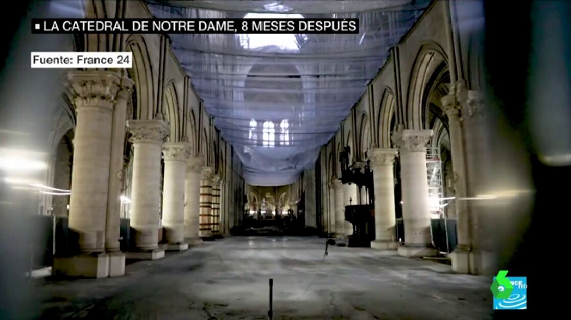 Ocho meses después del incendio que asoló Notre Dame, las cámaras de la televisión han entrado en la catedral: allí el panorama es desolador, con zonas aún a cielo abierto.