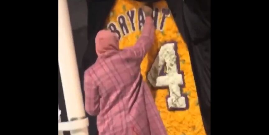 El mito de la NBA quiso rendir su particular homenaje al '24' de los Lakers con un espectacular mural de flores situado en el recinto de la celebración.