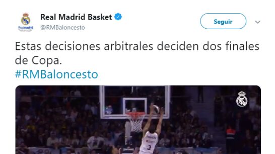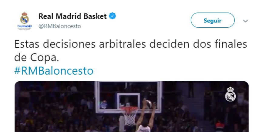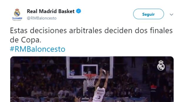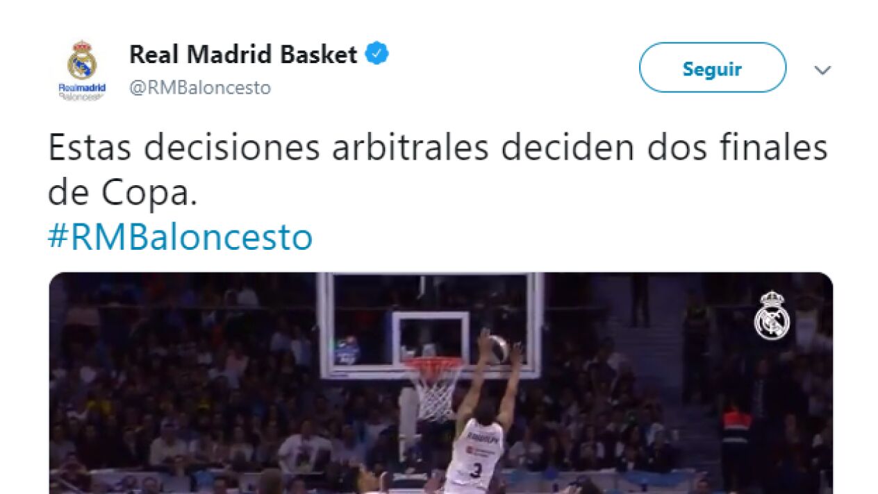 El Real Madrid expresó su indignación con la decisión arbitral en la jugada que definió a favor del Barcelona la final de la Copa del Rey, y pidió a la ACB que explique en un comunicado por qué anularon una acción que consideran "legal" ya que se sienten perjudicados por segundo año consecutivo en el torneo.