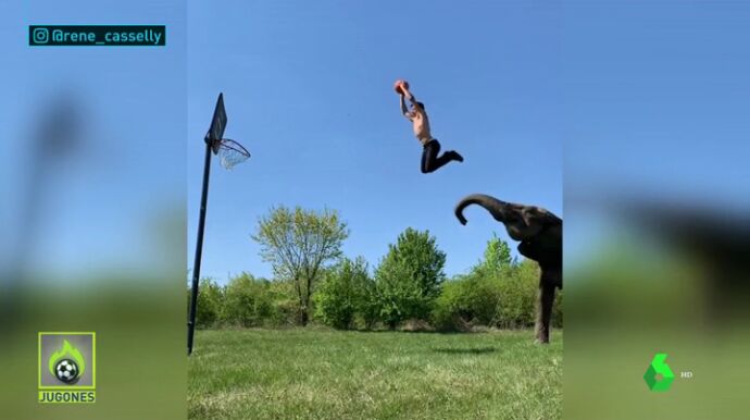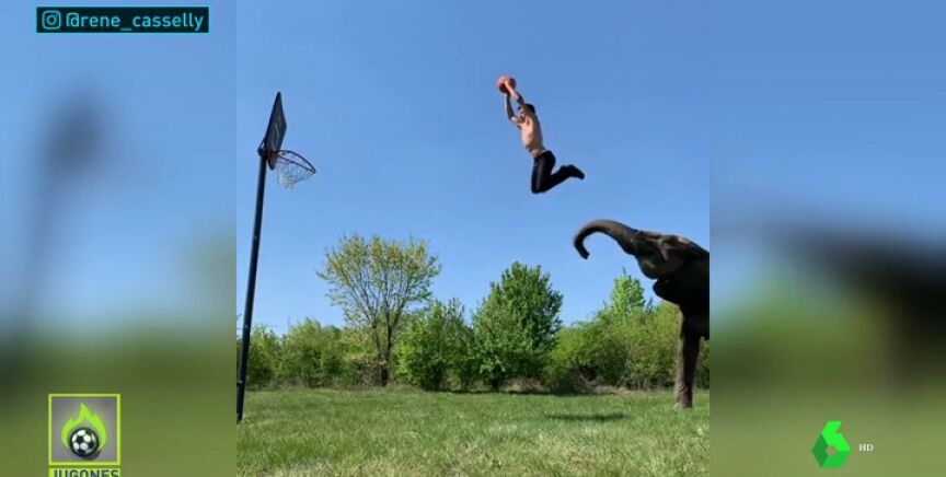 Llamativa imagen la que llega desde las redes sociales. Un chico se ayuda de un elefante para realizar un tremendo mate en una canasta. Lo vemos en Jugones.