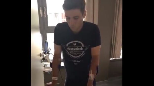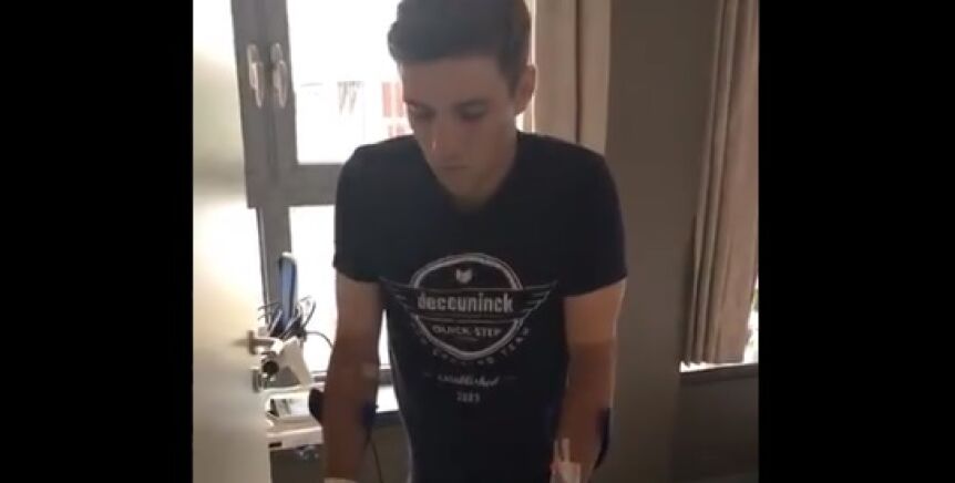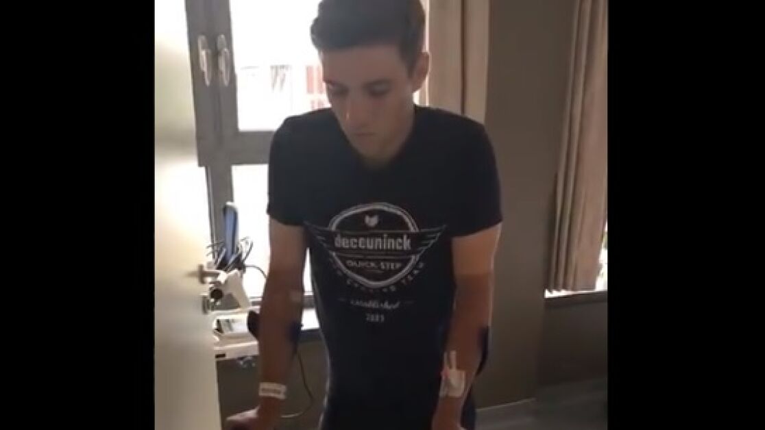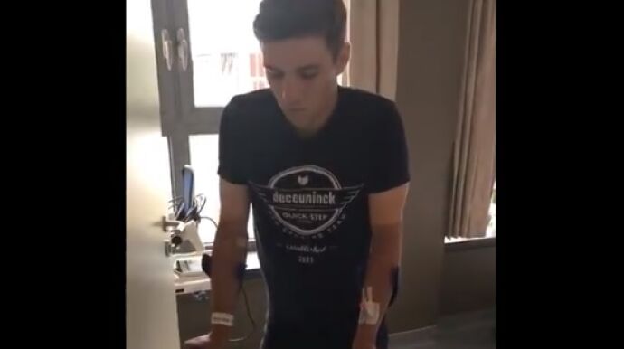 Su equipo, Deceunink-Quick Step, ha publicado las imágenes en sus redes sociales. En ese vídeo se puede ver cómo el ciclista da sus primeros pasos, ayudado por una muleta.