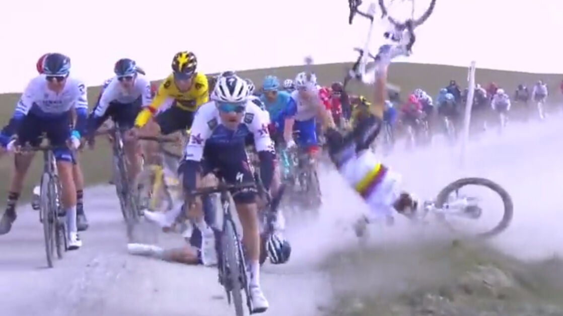 Y por la caída que se produjo a unos cien kilómetros de la meta en Siena bien ganado tiene ese apodo. El viento hizo que muchos corredores se fueran al suelo, y Alaphilippe dio incluso una vuelta de campana.