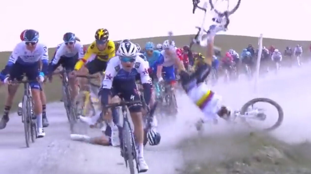 Las imágenes de la durísima caída de Julian Alaphilippe en la Strade Bianche
