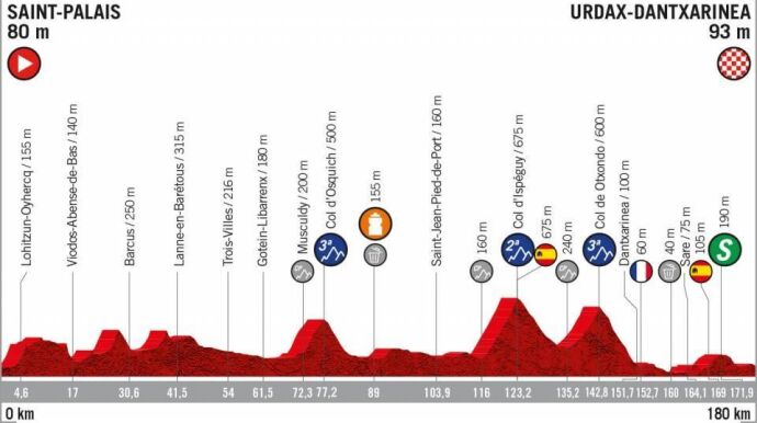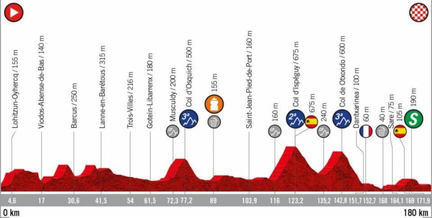 La etapa cuenta con un puerto de segunda categoría (Col d'Ispéguy) y con dos de tercera (Col d'Osquich y Col de Otxondo).
