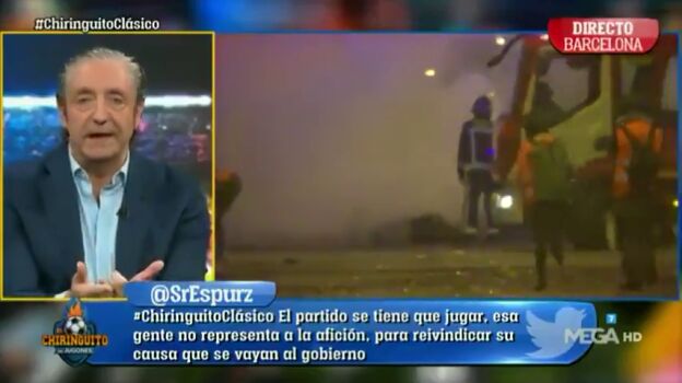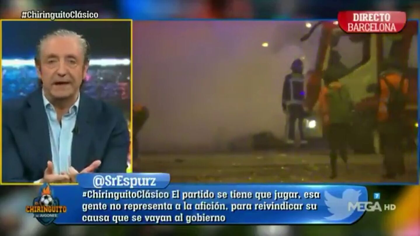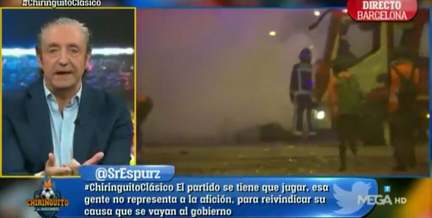 "Al principio pensaba: 'Que no cambien lo que está montado, que se juegue en el Camp Nou'. Pero luego me dicen: 'Se pueden plantear que el Real Madrid no salga del aeropuerto, que rompan el autobús del equipo, que monten barricadas para que nadie entre al estadio...'. Y luego con Torra sentado con Bartomeu en el palco... ¿cómo nos podemos fiar de que no pase algo en el Clásico en el Camp Nou?", defiende el presentador.