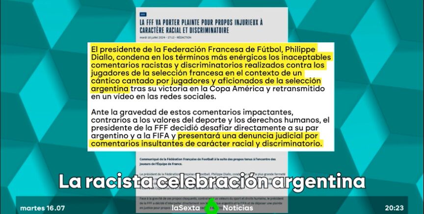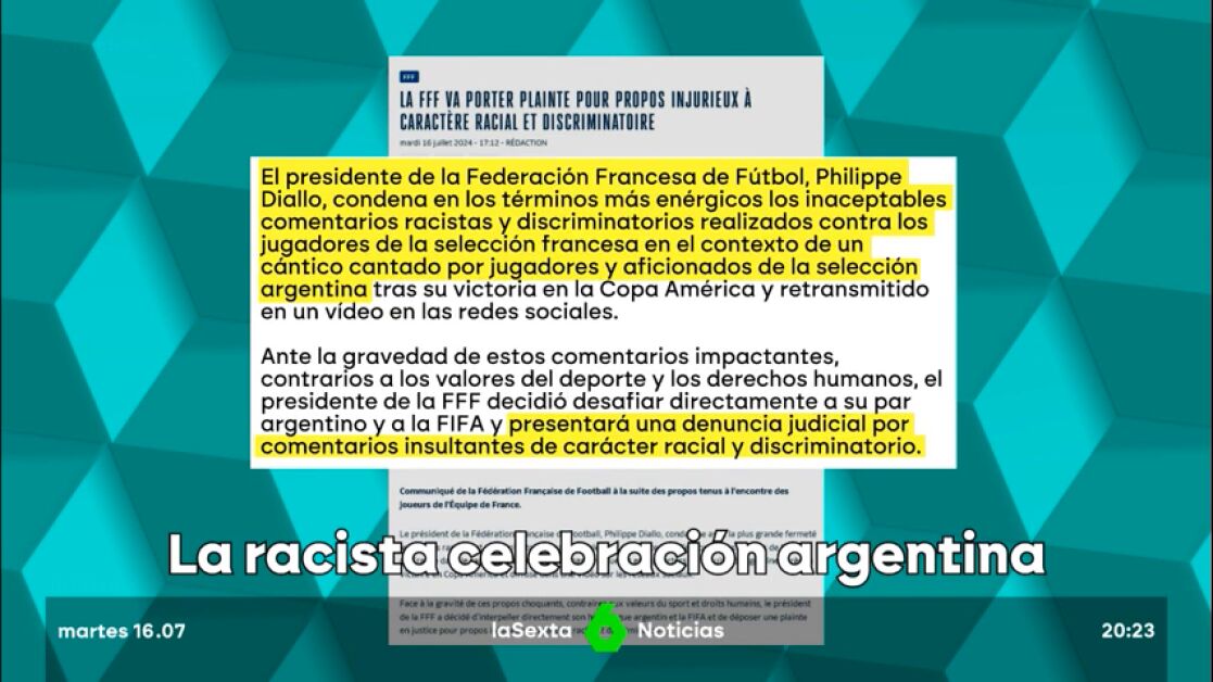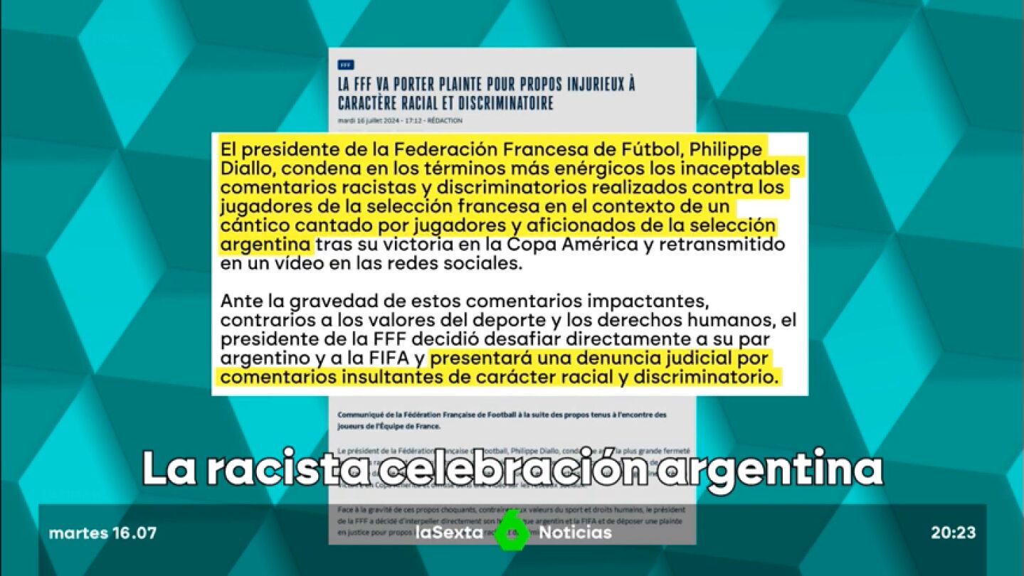 En el comunicado, no se precisa a qué instancia se presentará esa denuncia. La ministra de Deportes de Francia, Amélie Oudéa-Castéra, tildó de "patéticos" esos cánticos contra futbolistas franceses que se escuchan en un vídeo publicado en el perfil de Instagram del medio argentino Enzo Fernández mientras celebraba con sus colegas la Copa América conquistada el domingo.