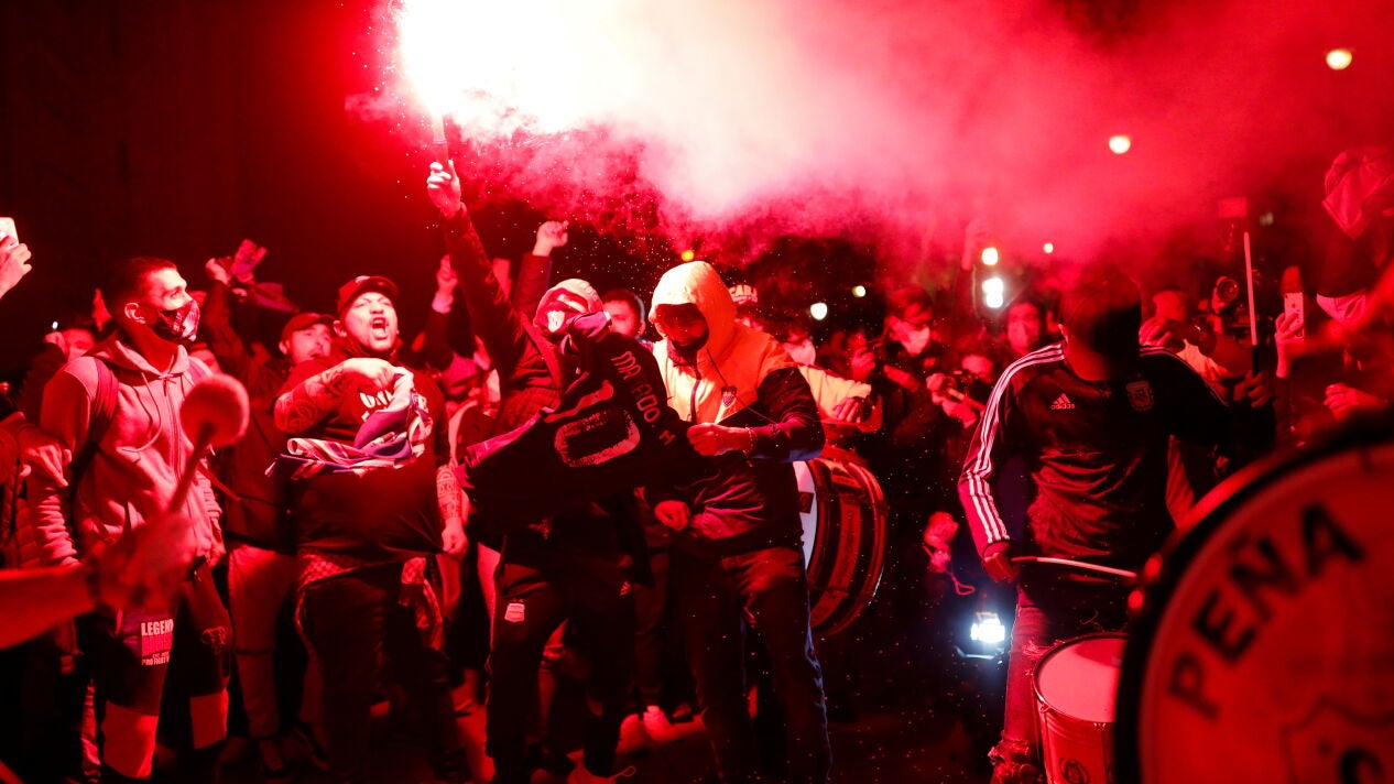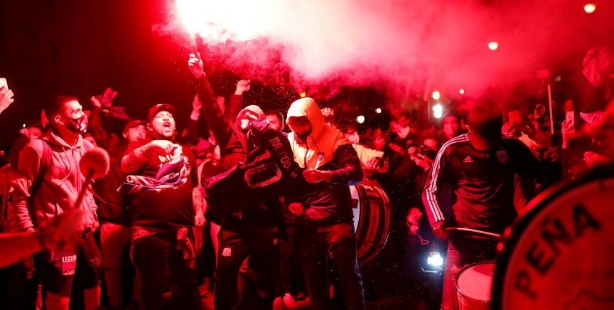 Cánticos, bengalas, bufandas, camisetas, pancartas... todos los ingredientes de la 'liturgia' fueron pocos para recordar al campeón del mundo en 1986, aunque lo que precisamente no sobró fue la distancia de seguridad y las mascarillas.