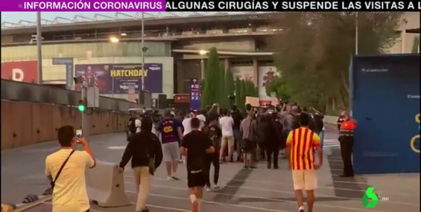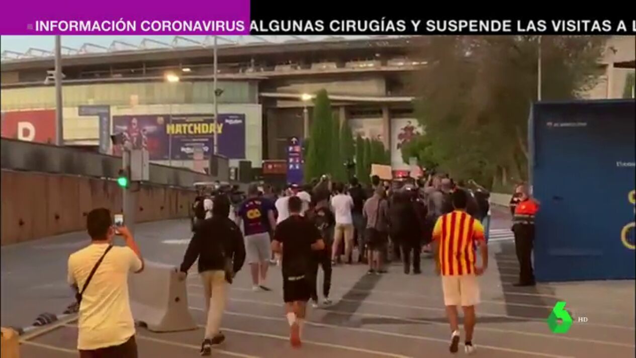 Un numeroso grupo de culés se han concentrado, pese a la delicada situación sanitaria de Barcelona, en los aldeaños del Camp Nou para mostrar su decepción.