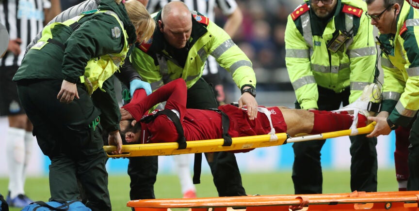 A punto de cumplirse el minuto 70 del partido entre el Newcastle United y el Liverpool, correspondiente a la jornada 37 de la Premier League, Salah se dio un topetazo en el césped y fue retirado por precaución totalmente inmovilizado.