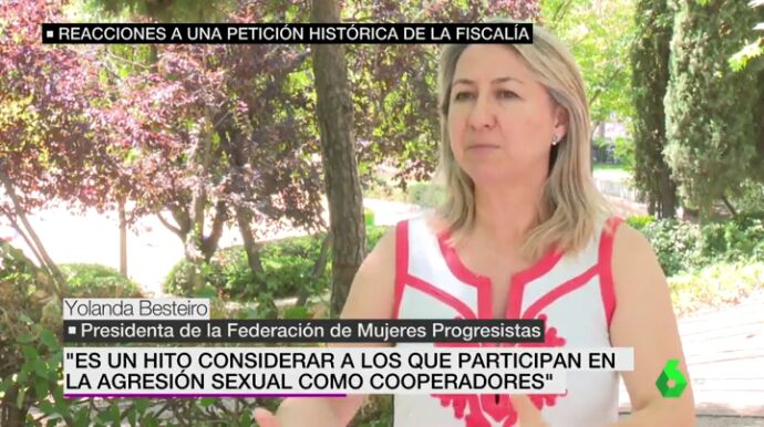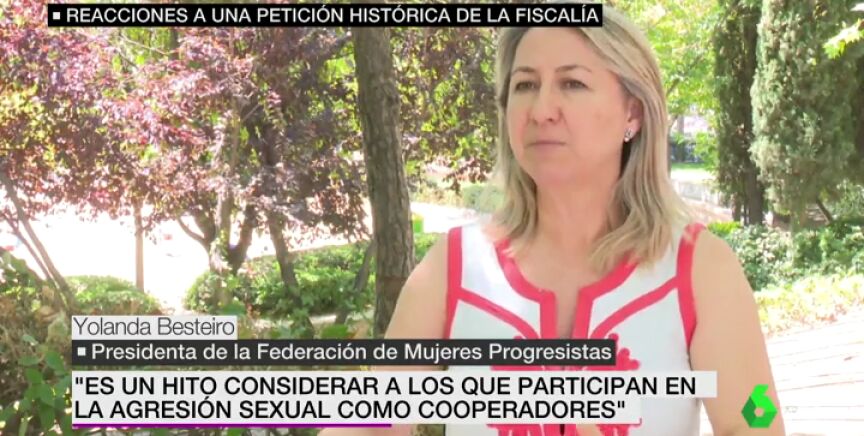 La petición de la Fiscalía de 38 a 40 años para los jugadores de la Arandina acusados de delito de agresión sexual ha sido considerada como un "hito" por la presidenta de la Federación de Mujeres Progresistas. "Es un hito que se considere a los participantes de la agresión como cooperadores", dice Yolanda Besteiro.