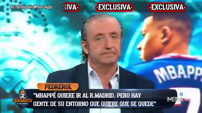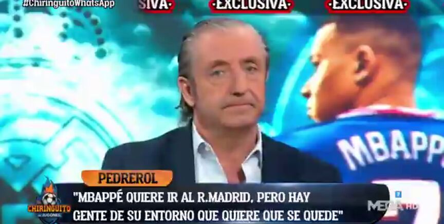 "Mbappé quiere jugar en el Real Madrid, pero hay una parte de su entorno más cercano que tiene dudas y preferiría que renovase con el París Saint-Germain dos o tres años, y que luego se fuese al Madrid", señaló el presentador del programa.