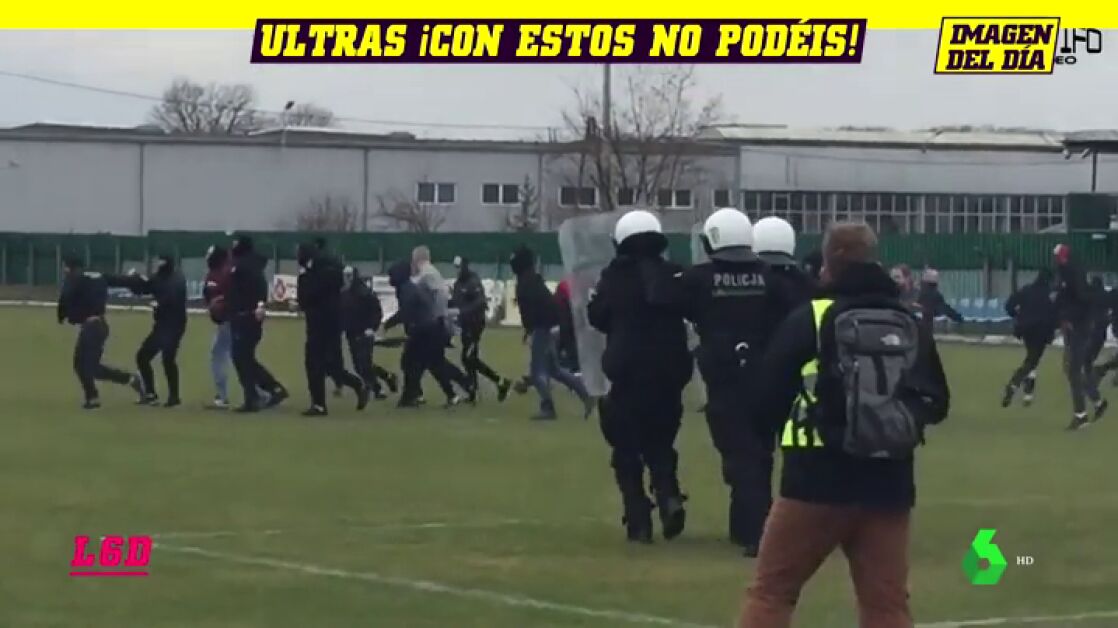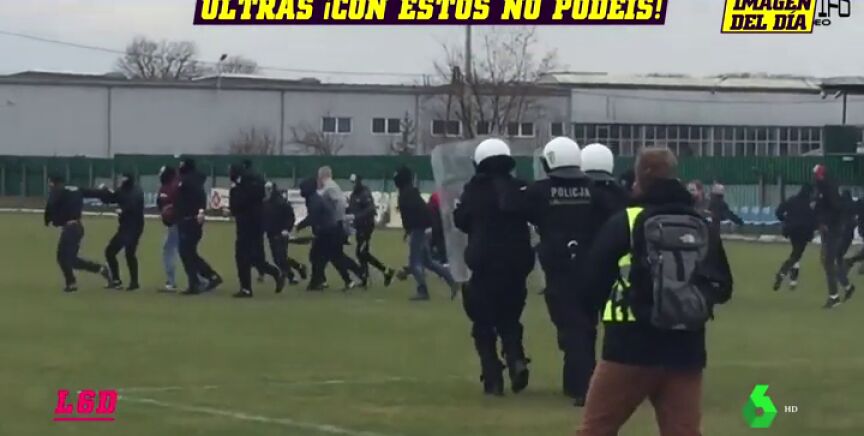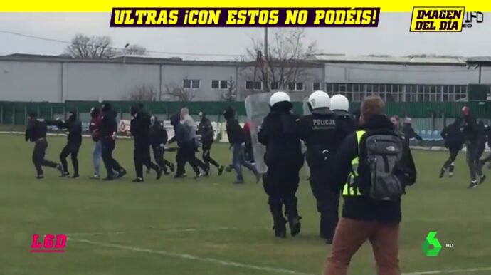 Tremenda imagen en un partido de cuarta división polaca. Ultras y agentes de policía se enfrentaron en pleno partido.
