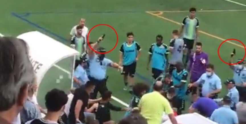 Armados con pistolas, varios policías dispararon hasta en nueve ocasiones al cielo. De hecho, uno de los agentes llegó a encañonar a uno de los jugadores con su arma, desatándose momentos de gran tensión.