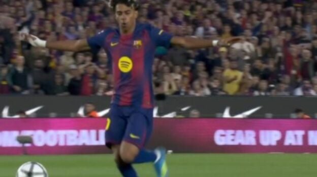 Lamine, antes de empujar el balón a placer para marcar el tercero, alzó los brazos celebrando el tanto incluso antes de marcarlo. La imagen es cuanto menos llamativa.
