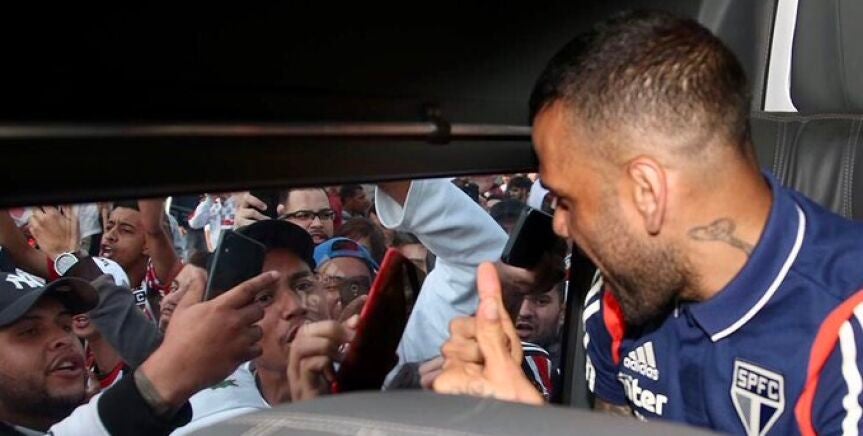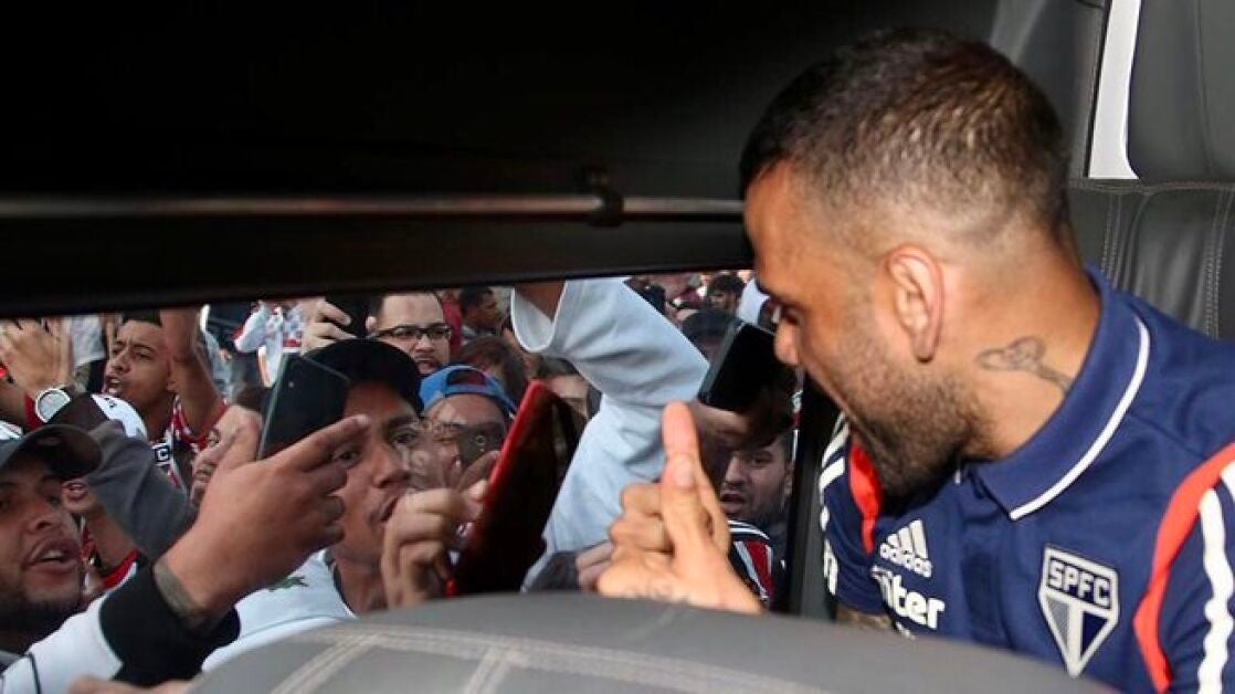 Dani Alves llegó al aeropuerto de Congonhas arropado por una marea humana de aficionados paulistas que no dudaron en recibir a su nuevo ídolo, incluso, con fuegos artificiales. Tuvo que ser escoltado por los miembros de seguridad para poder salir de la terminal.