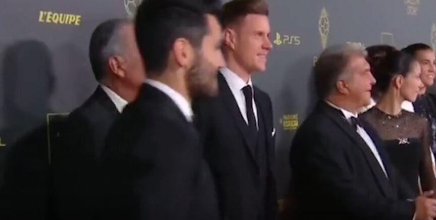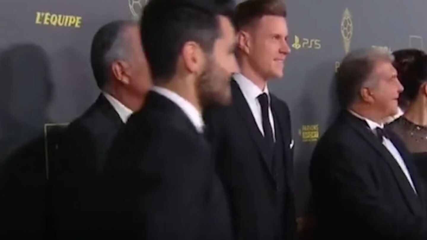 Sin embargo, no estaba muy contento en la ceremonia y, ante la sorpresa de compañeros como Marc André Ter Stegen, Alejandro Balde o incluso el vicepresidente Rafa Yuste, el alemán no dudó a la hora de abandonar la zona del 'photocall' sin fotografiarse con sus compañeros.