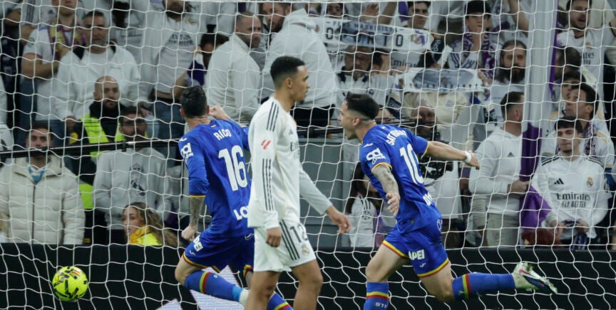 El plan del Getafe en el Bernabéu fue muy claro: una línea de cinco atrás y otra por delante de cuatro. Juntos, replegados. Sin conceder espacios. Seguramente en la única contra del Madrid, Vinicius estuvo a punto de hacer el primero. David Soria le puso el pie para enviar a córner.