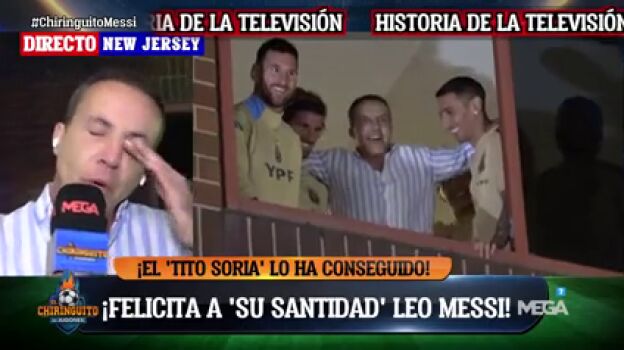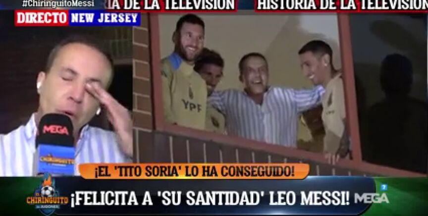 Emocionado, con lágrimas en los ojos y sin apenas poder articular palabra, Cristóbal Soria rompió a llorar en directo en 'El Chiringuito' tras salir junto a Leo Messi al balcón del hotel de la selección argentina para saludar a los miles de fans que se congregaron para festejar el 37 cumpleaños del rosarino.