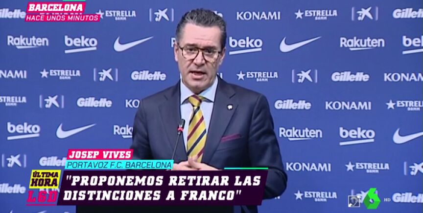 La junta directiva del Barcelona ha acordado dejar sin efecto las distinciones otorgadas al general Francisco Franco en 1971 y 1974 y todos los efectos honoríficos vinculados a su entrega, un acuerdo que tendrá que ser ratificado por los socios en la próxima asamblea de compromisarios. Así lo anunció el portavoz de la entidad, Josep Vives.