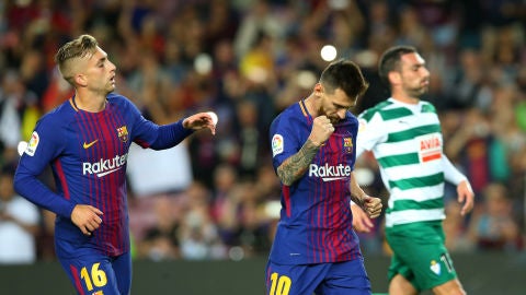 Palabra de Dios. De Leo Messi. El Barcelona es más que nunca el Fútbol Club Messi. El equipo que comanda Ernesto Valverde es un refresco agitado: descafeínado, sin demasiada fuerza, pero refresca. Hace su función. No exhibe un juego llamativo ni elaborado, ese que encandiló a todo el fútbol español, pero cuenta con un argentino de apenas 1,70 metros que está firmemente empeñado en convertir en oro todo balón que toca. Sin romper a sudar, Messi capituló a la Sociedad Deportiva Eibar con un triplete, al que le acompañaron los goles de Paulinho y Denis Suárez, que repiten diana tras las marcadas en el Coliseum Alfonso Pérez contra el Getafe.
