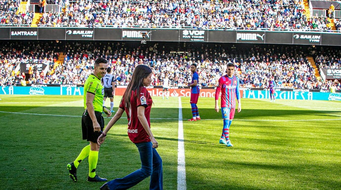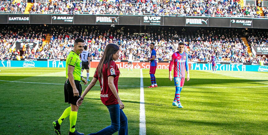 La valenciana Noah Higón, de 23 años, ha tocado el primer balón en el encuentro perteneciente a la 25º jornada de laLiga entre Valencia y Barca. La iniciativa corresponde a la campaña ‘ADN Mestalla Solidari’, un proyecto entre dos entidades, el club che y la Fundació VCF, en un homenaje al trabajo llevado a cabo por las ONG´s y asociaciones benéficas valencianas.