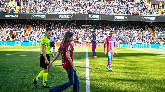 La joven Noah Higón, que sufre siete enfermedades raras y conciencia sobre ellas a través de sus redes sociales, ha sido la encargada de realizar el saque de honor en Mestalla, delante de toda la afición valencianista en la campaña ‘ADN Mestalla Solidari’.