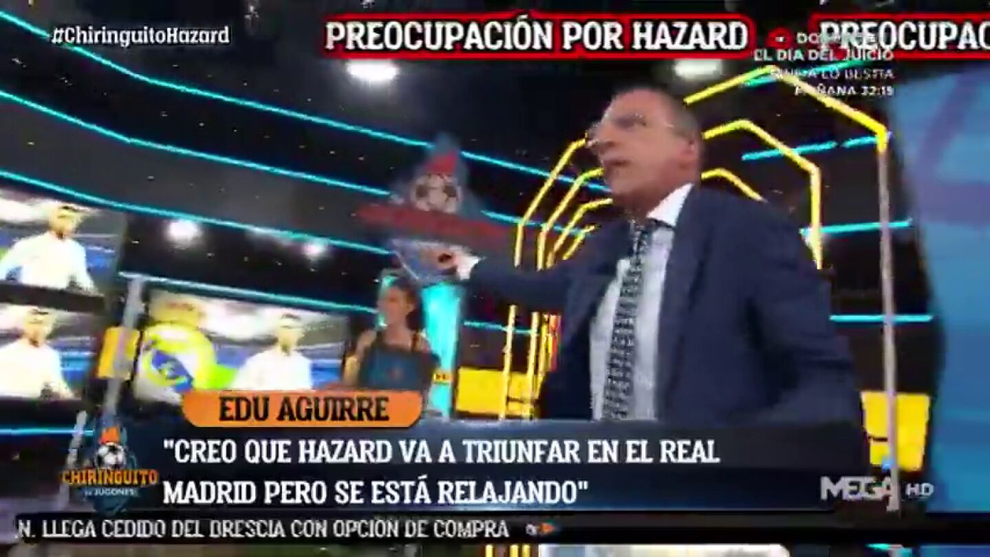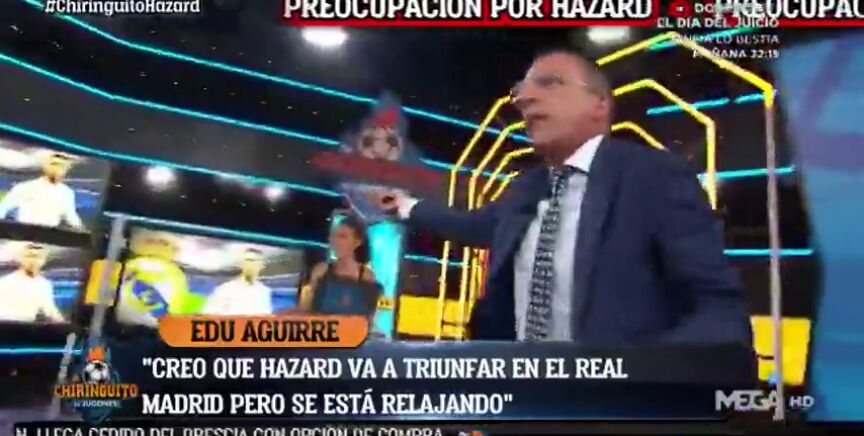 Mientras Edu Aguirre exponía su opinión sobre la mentalidad de Hazard como jugador del Real Madrid, el colaborador sevillano se levantó como un resorte de su asiento visiblemente enfadado.