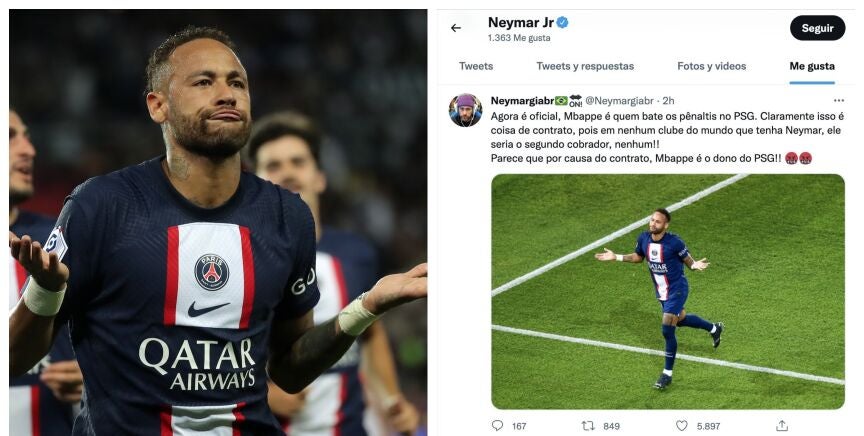 "Hoy en el partido del PSG, Neymar anotó y HUMILLÓ al portero (una vez más) en el penalti. Mbappé, en cambio, golpeó MUY mal y perdió. Tras el partido, el entrenador dijo que Mbappé será el principal lanzador del equipo. ¡Un absurdo!" y "El mejor lanzador de penaltis del mundo tiene nombre y apellido: Neymar da Silva Santos Júnior. Respeta mi 10, ¿ok?", fueron los otros dos tweets que el brasileño decidió dar 'me gusta'.