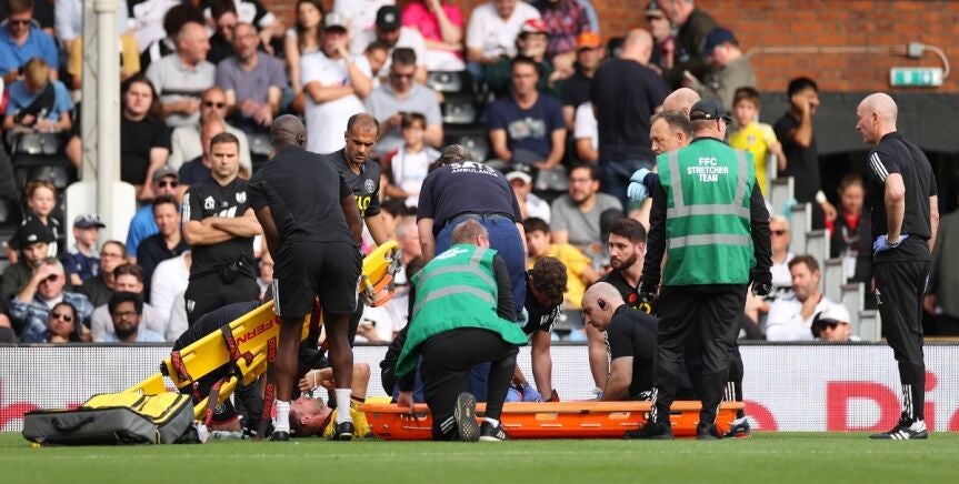 El futbolista, trasladado en camilla, recibió la ovación de Craven Cottage, estadio del Fulham, y lo agradeció levantando su brazo con el pulgar hacia arriba.