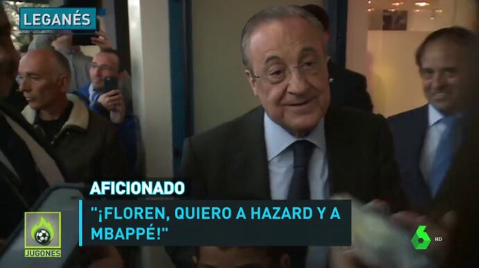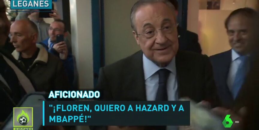Un aficionado del Real Madrid pidió al presidente blanco los fichajes de Mbappéy Hazard para la próxima temporada en la llegada de la expedición blanca a Butarque para el partido contra el Leganés. Lo vemos en este vídeo exclusivo de Jugones.