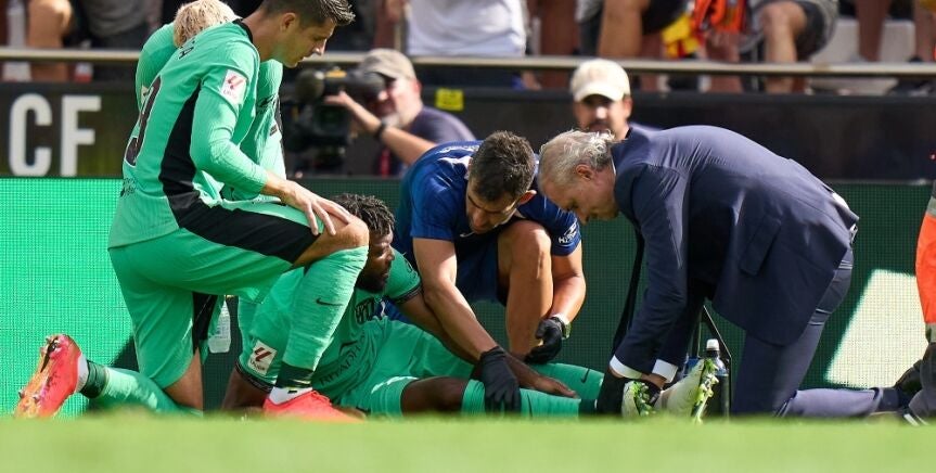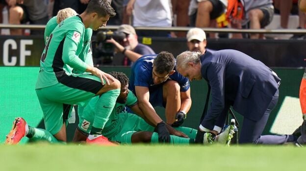 El futbolista francés se marchó en camilla del encuentro que el Atlético de Madrid disputaba en Mestalla y las primeras exploraciones indican que se podría tratar de una rotura del tendón de Aquiles.