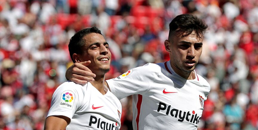 Otro remate con intención de Jesús Navas, en el que el balón se fue por encima del larguero, fue un nuevo intento local, preludio del 1-0 sevillista poco antes del descanso, obra del punta francotunecino Wissam Ben Yedder, muy atento en el rechace del meta Iago Herrerín.