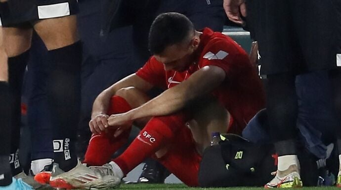 Lamentable agresión a Joan Jordán en el transcurso del partido de Copa del Rey entre el Betis y el Sevilla. El derbi, disputado en el Benito Villamarín, se tuvo que suspender unos minutos después de que un palo alcanzase la cabeza del jugador sevillista.