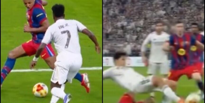 El final de la primera parte de la Supercopa de España fue increíble. En una añadido de siete minutos, se marcaron tres goles. Ante un Madrid que estaba dejando mucho que desear en ataque, Vinícius asumió la responsabilidad. Encaró a Koundé a muchos metros de la portería blaugrana y poco a poco fue ganándole distancia.