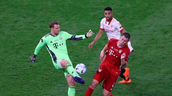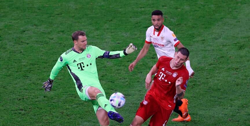Sufrir. El término que resume el partido de cualquier rival del Bayern Munich. No fue menos el Sevilla, hexacampeón de la Europa League, en la final de la Supercopa de Europa. Se puso por delante nada más arrancar tras un penalti a Ivan Rakitic, que regresó a la capital andaluza en este mismo verano, pero no aguantó los empujes constantes del cuadro alemán. Un rival imparable desde hace meses. Y un rival con un portero que marca diferencias: Manuel Neuer.