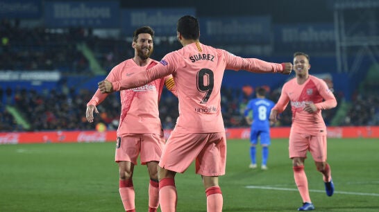 El argentino Leo Messi y el uruguayo Luis Suárez, con dos goles en la primera mitad, permitieron al Barcelona llevarse con sufrimiento la victoria de Getafe (1-2), puesto que el equipo madrileño, que redujo distancias antes del descanso, tuvo ocasiones muy claras para empatar en la segunda parte.