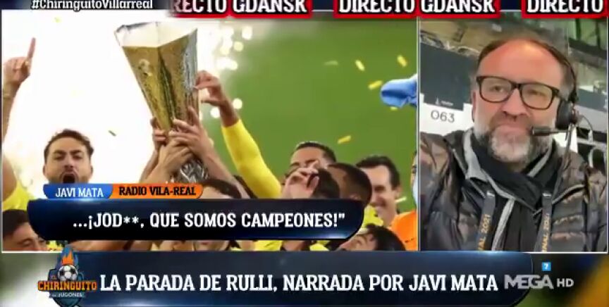 "Va De Gea, yo no puedo más. Va De Gea, Va De Gea, esta es la nuestra, Va De Gea, Va De Gea, De Geaaaaa...¡Rulli la para!¡Somos campeones! ¡Somos campeones! ¡Somos campeones!, ¡Somos campeones! ¡Somos campeones! El Villareal CF es campeón de la UEFA Europa League. La para Gero Rulli. ¡Rulli Rulli Rulli! Acaba de parar el penalti de su vida, ¡de nuestra vida! Somos campeones de la Europa League. La gente bota, chilla, se vuelve loca. ¡El 'poblet' acaba de ganar la Europa League!", gritaba Mata desde el estadio.