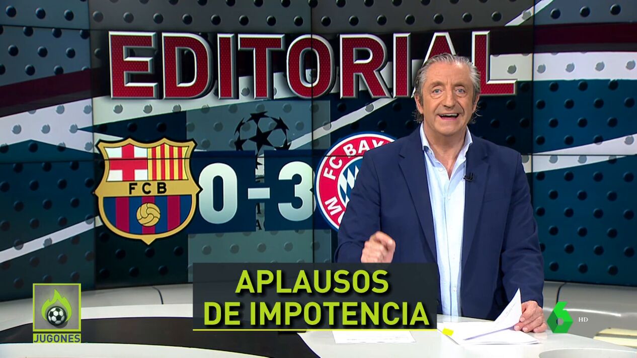 En su editorial en 'Jugones', Josep Pedrerol ha analizado la segunda debacle europea consecutiva del FC Barcelona: "84.000 personas en la grada con el Barça ya eliminado de la Champions. Y aplausos al final del partido tras la humillación del Bayern".
