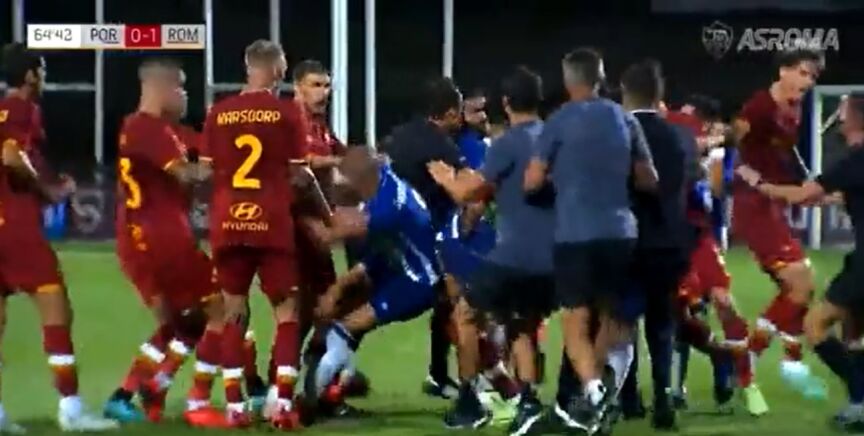 Los jugadores romanos no tardaron en echarse encima del portugués, al igual que el propio afectado, creando una 'melé' en el terreno de juego a la que se unieron varios integrantes de los banquillos de ambos equipos.