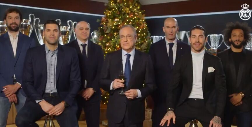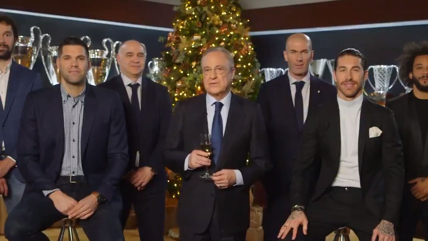 El Real Madrid ha compartido su tradicional felicitación navideña, un mensaje liderado por el presidente del club, Florentino Pérez, rodeado por los entrenadores y capitanes de las secciones de fútbol y baloncesto.